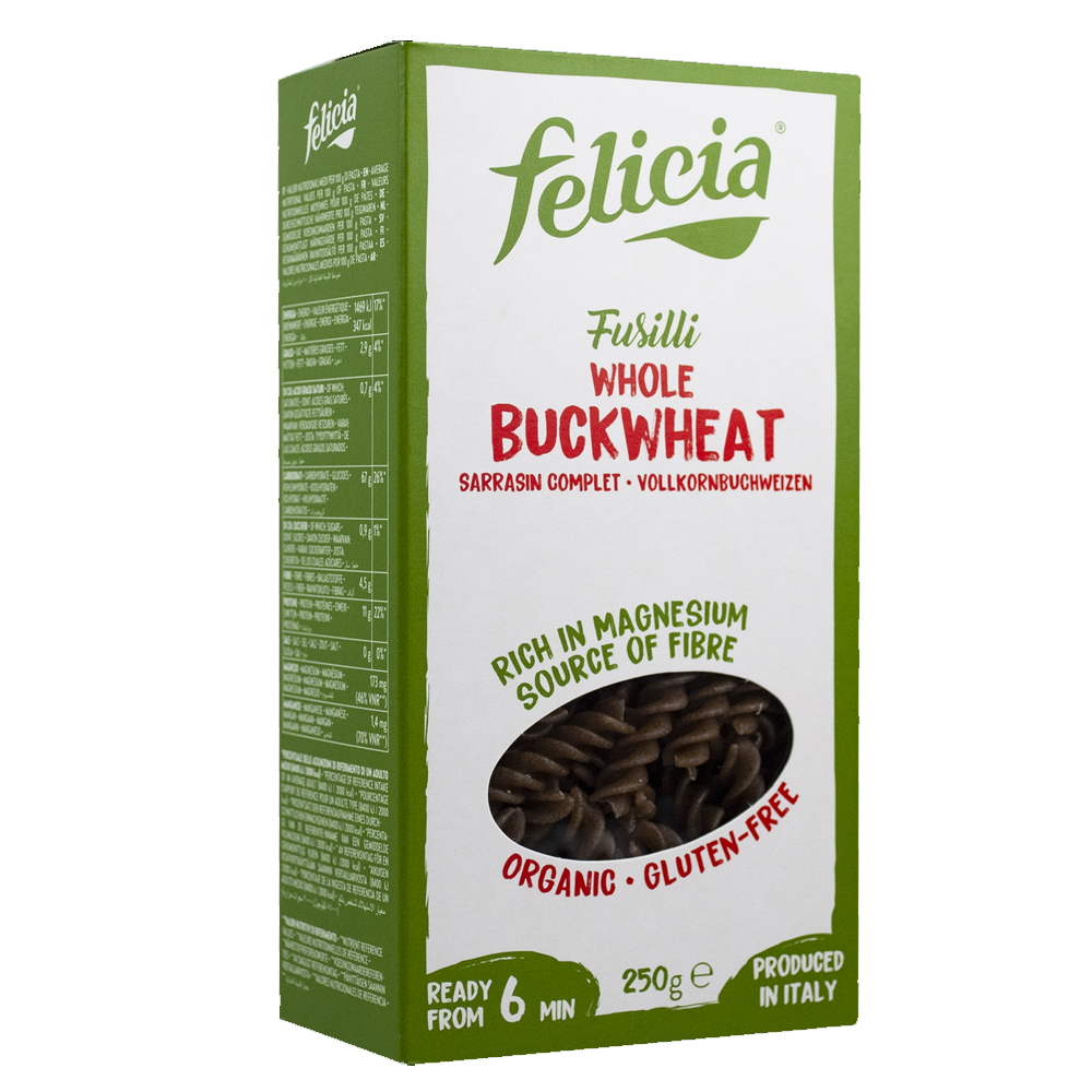 Βιολογικές βίδες φαγόπυρου ολικής άλεσης χωρίς γλουτένη .Περιέχει πρωτεΐνες και ανόργανα συστατικά. Πλούσιο σε βιταμίνες της ομάδας Β, βιταμίνες Ε και Κ, φολικό οξύ, μέταλλα όπως το ασβέστιο, ο χαλκός, ο σίδηρος, το μαγνήσιο, το μαγγάνιο, ο φώσφορος, το κάλιο, το σελήνιο και ο ψευδάργυρος.