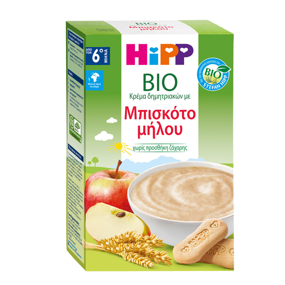 Συστατικά: Χυλός μήλου* 44 %, αλεύρι σίτου ολικής άλεσης* 13 %, αλεύρι βρώμης ολικής άλεσης*, αλεύρι κριθαριού ολικής άλεσης*, σιμιγδάλι σίτου* 9%, μπισκότα* 8 % ( αλεύρι σίτου * 5%, προϊόν ορού γάλακτος*, βούτυρο*, άμυλο σίτου *), καλαμποκάλευρο*, εκχύλισμα μήλου, βιταμίνη B1 .