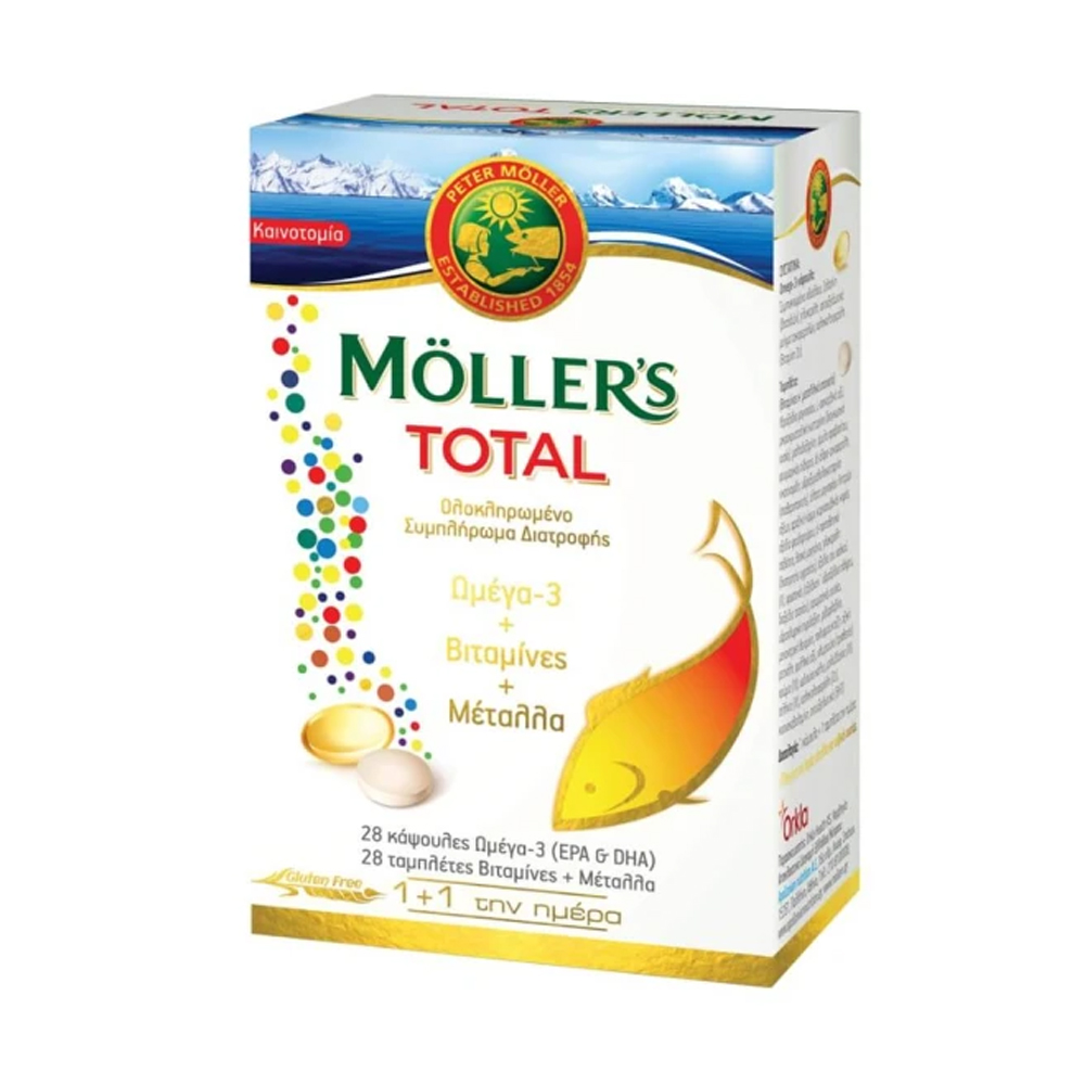 Το Moller's Total είναι ένα ολοκληρωμένο συμπλήρωμα διατροφής που συνδυάζει κάψουλες και ταμπλέτες για την υποστήριξη της συνολικής υγείας. Περιέχει έναν συνδυασμό από θρεπτικά συστατικά που ενισχύουν την ευεξία και την ενέργεια.