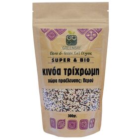 Βιολογική τρίχρωμη κινόα, από λευκούς μαύρους και κόκκινους σπόρους. Ένας πολύχρωμος θρεπτικός συνδυασμός με μοναδική υφή και εξαιρετική γεύση, με χώρα προέλευσης το Περού. Αποτελούσε βασική διατροφή του πολιτισμού των Ίνκας η οποία ξεχωρίζει ανά τους αιώνες για την υψηλή θρεπτική της αξία. Πλούσια σε φυτικές ίνες, πρωτεΐνες και αμινοξέα, περιέχει επίσης κάλιο, σίδηρο, ψευδάργυρο και διάφορες βιταμίνες του συμπλέγματος Β. Ιδιαίτερα εύπεπτη διότι δεν περιέχει γλουτένη.