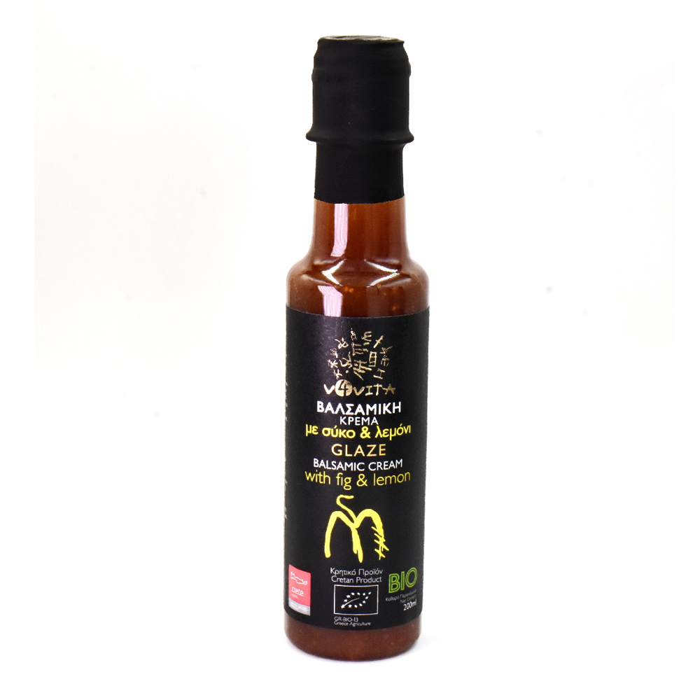 Χρησιμοποιώντας την βαλσαμική κρέμα glaze με σύκο και λεμόνι, σίγουρα θα εκπλήξετε ευχάριστα τους συνδαιτημόνες σας! Με συμπυκνωμένο μούστο λευκών σταφυλιών, ξίδι από σταφύλια κρητικών ποικιλιών, σύκο και λεμόνι, αυτό το 100% φυσικό προϊόν σας δίνει την δυνατότητα να δημιουργήσετε νέα συναρπαστικά πιάτα.