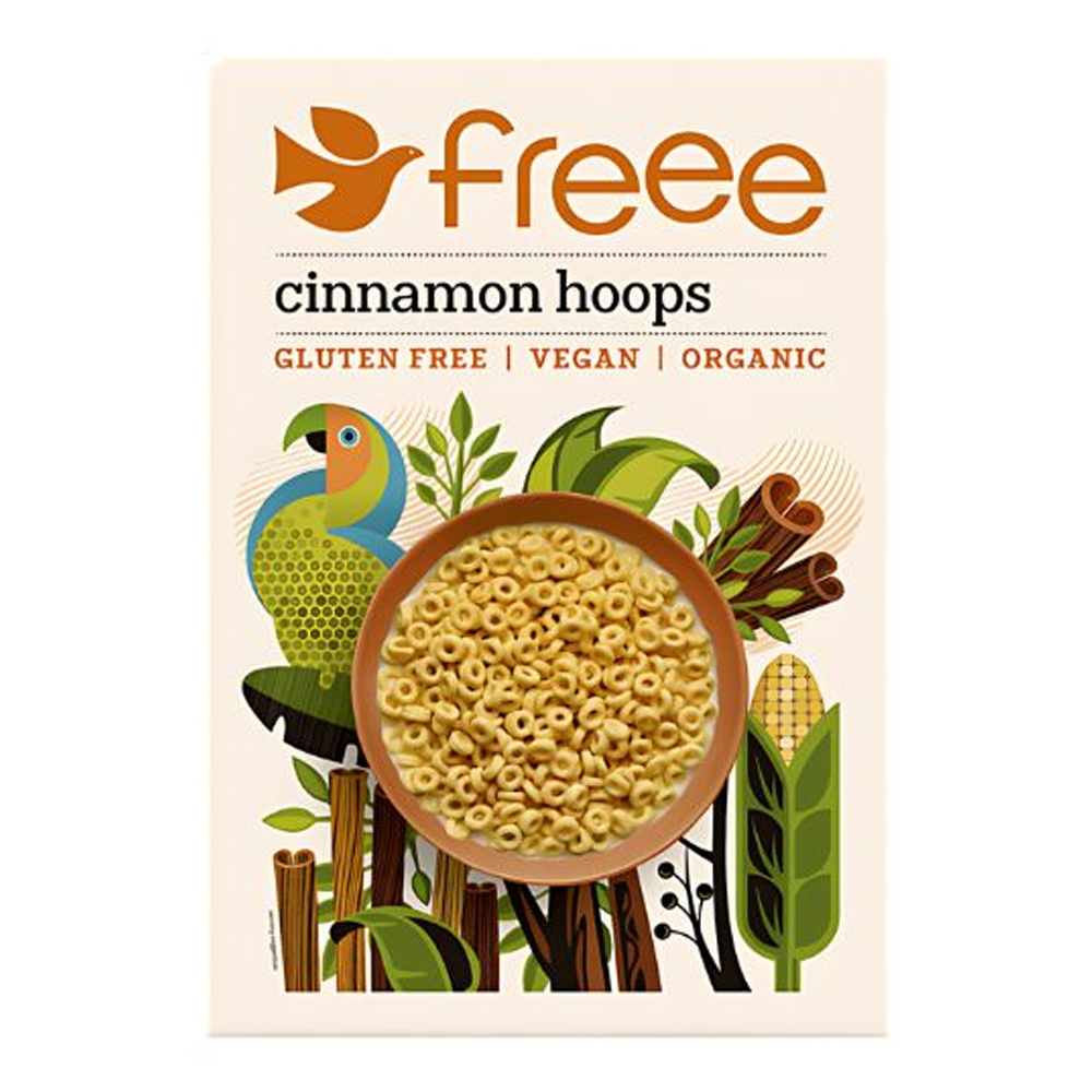Τα βιολογικά Cinnamon Hoops χωρίς γλουτένη, προσφέρουν μια απολαυστική εμπειρία πρωινού, φτιαγμένα από αραβόσιτο βιολογικής καλλιέργειας, πασπαλισμένα απαλά με κανέλα και ζάχαρη. Ειδικά σχεδιασμένα για δίαιτες χωρίς γλουτένη, βιολογικές και vegan, για ένα απολαυστικό και υγιεινό πρωινό.