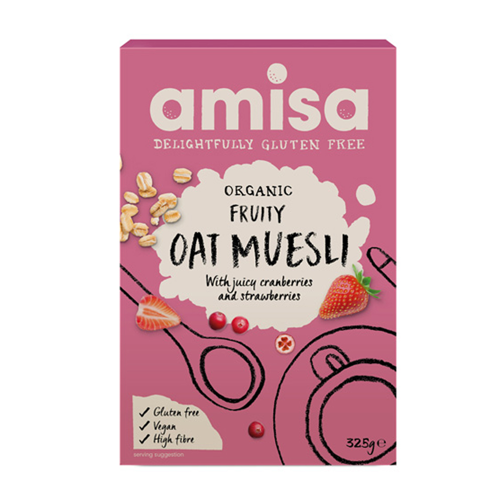 Βιολογικό μούσλι βρώμης με 19% φρούτα, χωρίς γλουτένη και χωρίς ζάχαρη. Ένας γευστικός και θρεπτικός συνδυασμός από την Amisa με βρώμη χωρίς γλουτένη ολικής άλεσης, ζουμερά κράνμπερις, σταφίδες, μήλα, φράουλες, χρυσό λιναρόσπορο και ηλιόσπορο. Πλούσιο σε φυτικές ίνες.