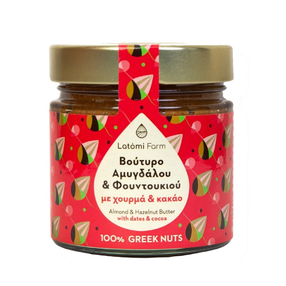 Το Βούτυρο αμυγδάλου και φουντουκιού με χουρμά και κακάο Latomi Farm είναι η απάντησή μας σε μια μεγάλη πρόκληση: να φτιάξουμε την υγιεινή εκδοχή της πραλίνας, που τόσο όλοι αγαπάμε! Με έμπνευση, πάθος, εξαιρετική πρώτη ύλη και δοκιμαστές τους πιο απαιτητικούς κριτές, τα παιδιά μας, πιστεύουμε πως καταφέραμε να δημιουργήσουμε ένα απαλό, πλούσια σοκολατένιο άλειμμα, που ικανοποιεί την όρεξη για γλυκό χωρίς ενοχές! Με 50% ελληνικά αμύγδαλα από το κτήμα μας, 41% φουντούκια από επιλεγμένους Έλληνες παραγωγούς, βιολογικό σιρόπι χουρμά από 100% χουρμάδες και 2% βιολογικό περουβιανό κακάο ηθικής καλλιέργειας είμαστε σίγουροι ότι προσφέρουμε με κάθε βαζάκι μας όχι μόνο την πιο υγιεινή, αλλά και την πιο αγνή εκδοχή της πραλίνας EVER!