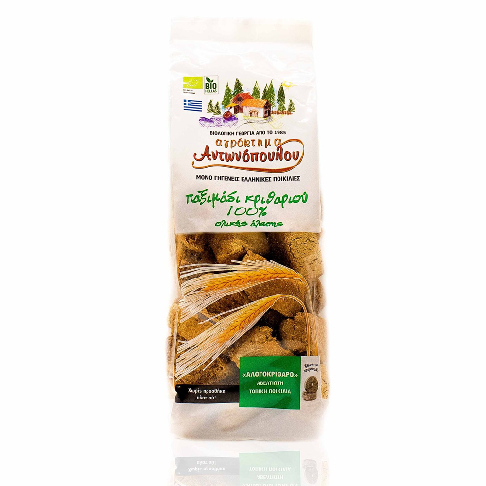 Παξιμάδι κριθαριού ολικής άλεσης βιολογικής γεωργίας από την διατηρητέα αβελτίωτη τοπική ποικιλία κριθαριού του αγροκτήματος «Αχίλλειος» («ACHILIOS»), εγγεγραμμένη στον Εθνικό Κατάλογο Σιτηρών μετά από πολύχρονο αγώνα.