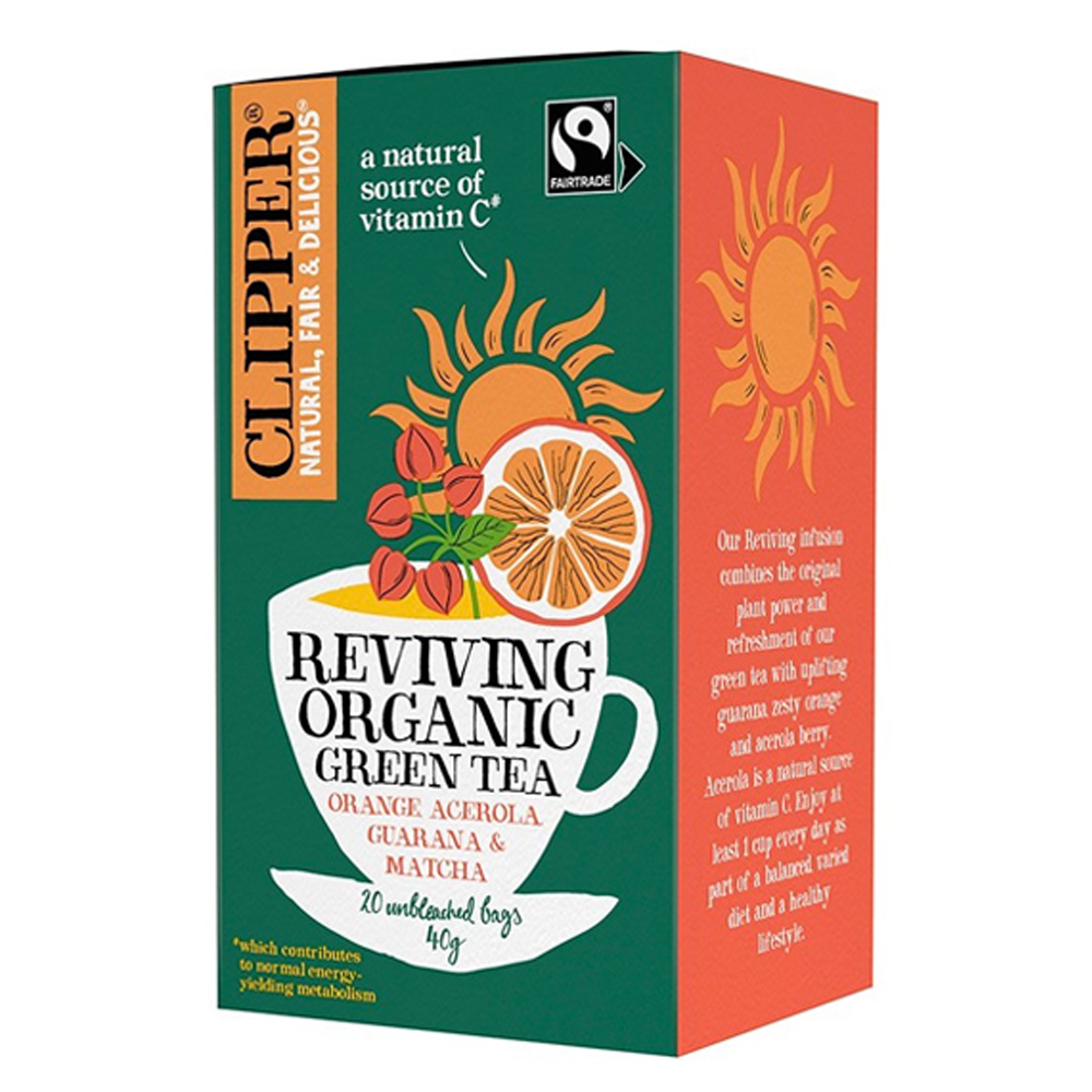 Το βιολογικό μείγμα Reviving συνδυάζει την αυθεντική δύναμη και την αναζωογονητική αίσθηση του Πράσινου Τσαγιού με τονωτικό Guarana (Γκουαρανά), ξύσμα Πορτοκαλιού, αντιοξειδωτικό μούρο Acerola (Ασερόλα) και τσάι Matcha (Μάτσα).
