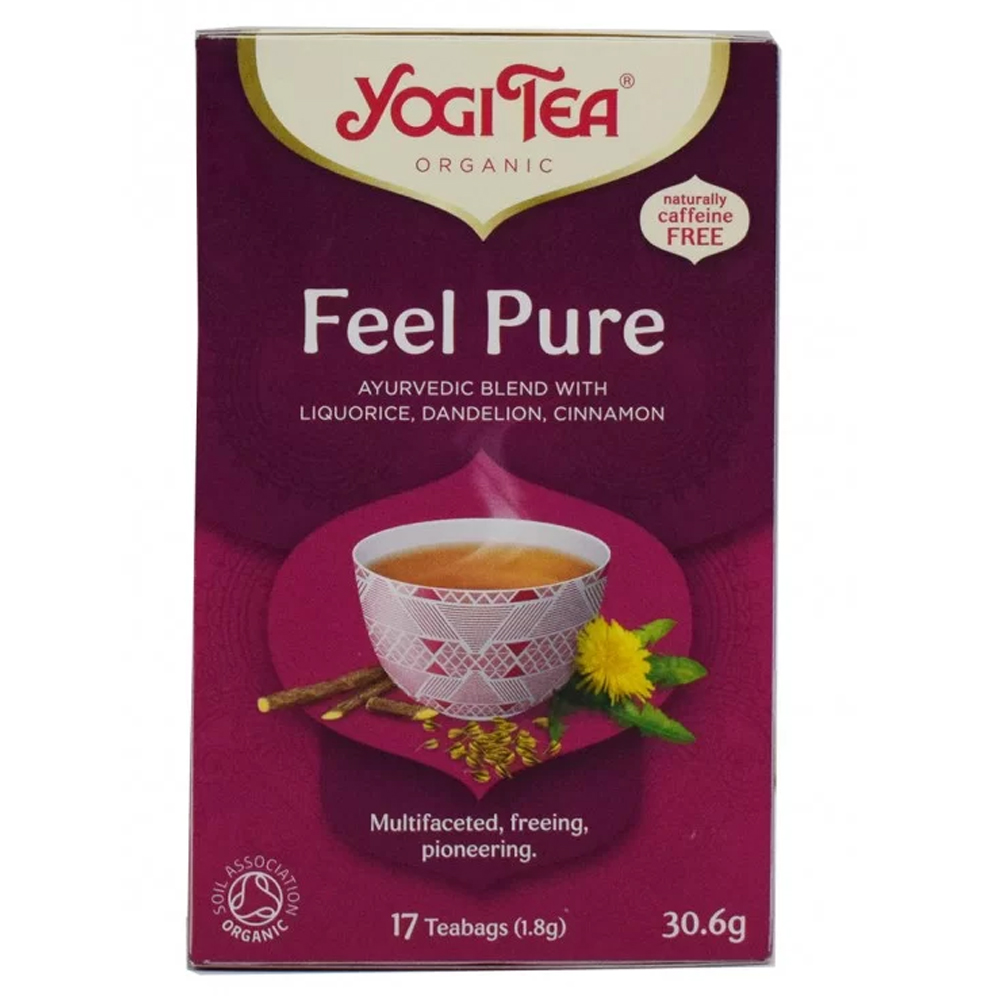 Το Yogi Tea Feel Pure Bio είναι ένα ρόφημα βοτάνων και μπαχαρικών που βοηθούν την αποτοξίνωση του σώματος. Περιέχει γλυκόριζα, κανέλα, πικραλίδα, κολλιτσίδα, μαύρο πιπέρι, γλυκάνισο, μαϊντανό, γαρύφαλλο, κουρκουμά κ.ά.
