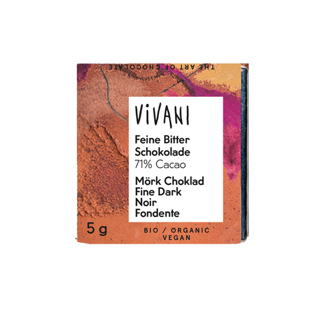 Χάρτινη συσκευασία από βιολογικό σοκολατάκι από βιολογική μαύρη σοκολάτα έντασης 71% κακάο. Παρασκευάζονται από συστατικά πιστοποιημένης βιολογικής γεωργίας, μη γενετικά τροποποιημένα. Δεν περιέχει λεκιθίνη σόγιας. Οι σοκολάτες της Vivani παρασκευάζονται με μια διαδικασία υψηλών προδιαγραφών και αυστηρών ελέγχων. Η κάθε συνταγή είναι μοναδική και βασισμένη σε ποικιλίες κακάο εξαιρετικής ποιότητας προσφέροντας μοναδικές γευστικές απολαύσεις.