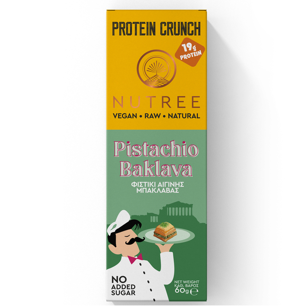 Μοντέρνα παραλλαγή της παραδοσιακής ελληνικής συνταγής μπακλαβά, με τραγανή υφή, με πλούσια γεύση φιστικιού Αιγίνης, στην υγιεινή εκδοχή της χωρίς σιρόπια ή άλλα γλυκαντικά.