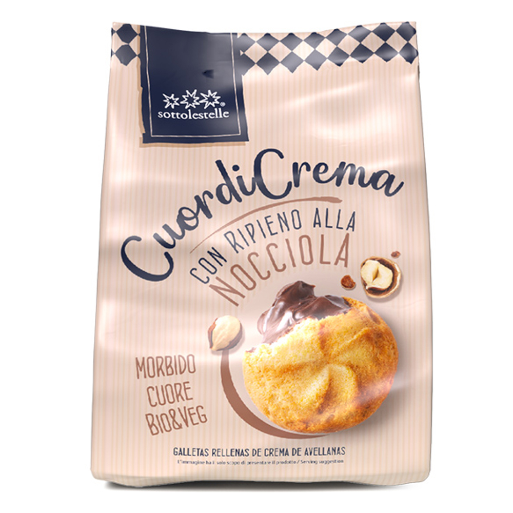 Βιολογικά και vegan μπισκότα με καρδιά από κρέμα φουντουκιού. Τα γεμιστά μπισκότα Cuordi Crema ψήνονται σε φούρνο, όπως προτείνει η παραδοσιακή Γαλλική συνταγή από την οποία έχουν εμπνευστεί. Νόστιμα και ποιοτικά, απολαύστε τα με καφέ, τσάι ή κάθε φορά που θέλετε κάτι γλυκό.