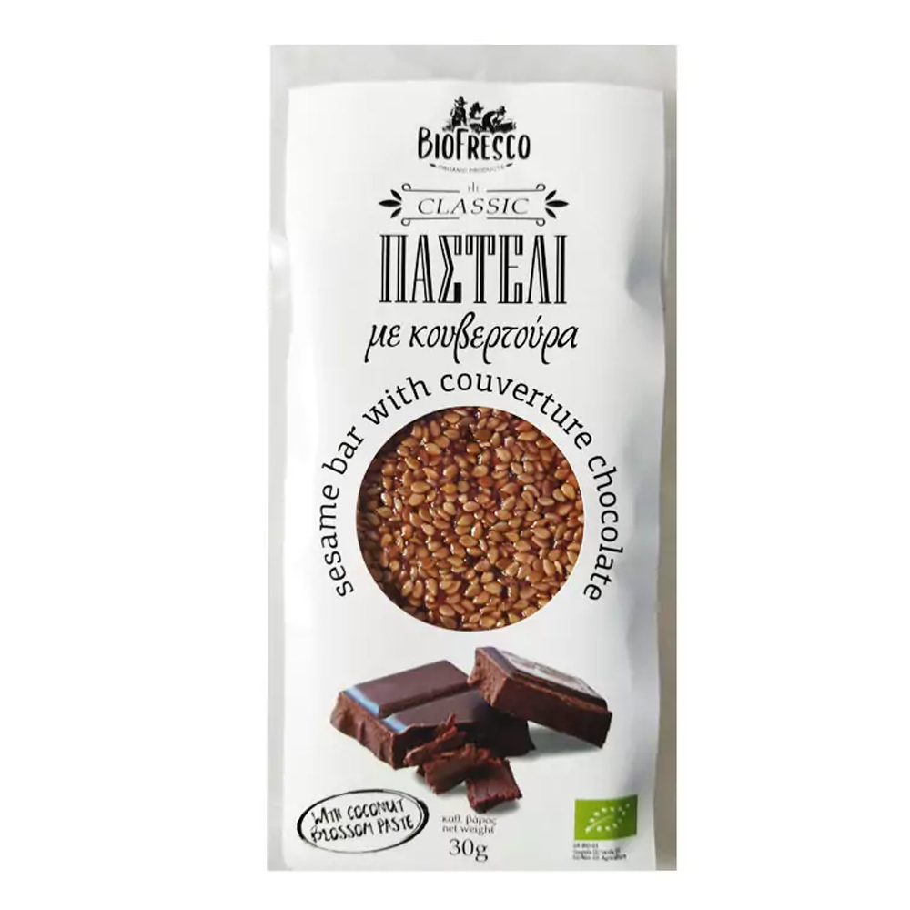 Αυτή η νέα εκδοχή του παραδοσιακού παστελιού διατηρεί την ίδια αγνή και υψηλής ποιότητας σύνθεση, με τη μόνη προσθήκη αυτή της κουβερτούρας, προσθέτοντας μια πλούσια, γλυκιά νότα που αναδεικνύει τέλεια την φυσική γεύση του σουσαμιού και της πάστας ανθού καρύδας.