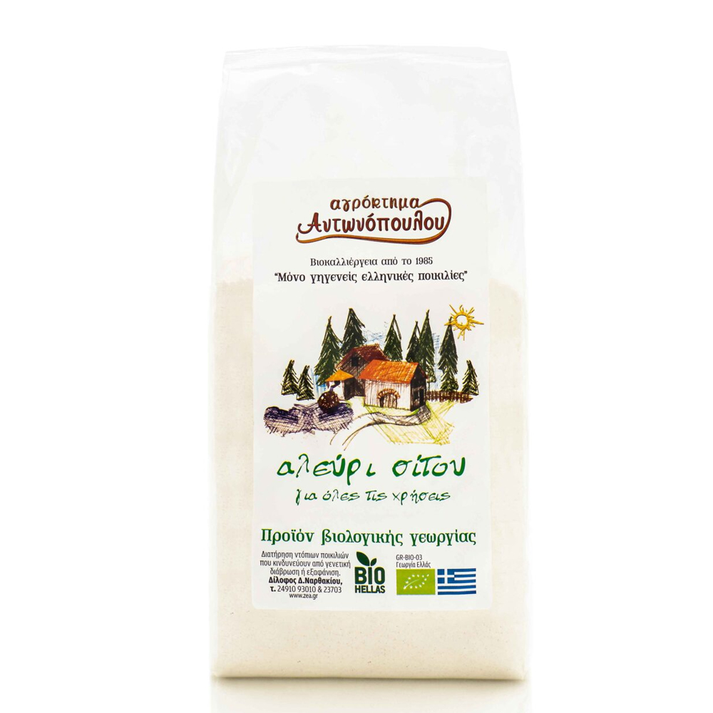 Το αλεύρι σιταριού της εταιρείας Αγρόκτημα Αντωνόπουλου, παράγεται από μαλακό σιτάρι και έχει χαμηλή περιεκτικότητα σε πρωτεΐνες και γλουτένη, με αποτέλεσμα η ζύμη να μην έχει τόση ελαστικότητα. Είναι κατάλληλο για την εκτέλεση συνταγών ζαχαροπλαστικής, όπως κέικ, μπισκότα, κουλουράκια και άλλα γλυκά. Πρόκειται για προϊόν πιστοποιημένης βιολογικής καλλιέργειας, όπου δεν έχει γίνει η χρήση φυτοφαρμάκων και χημικών λιπασμάτων κατά την παραγωγή του. Προέρχεται από την άλεση ολόκληρου του καρπού, δηλαδή μαζί με το πίτουρο και το φύτρο. Έχει πιο έντονη και γεμάτη γεύση και είναι πηγή διαιτητικών ινών με πλούσια περιεκτικότητα σε βιταμίνες B1, B3 και μεταλλικά στοιχεία.