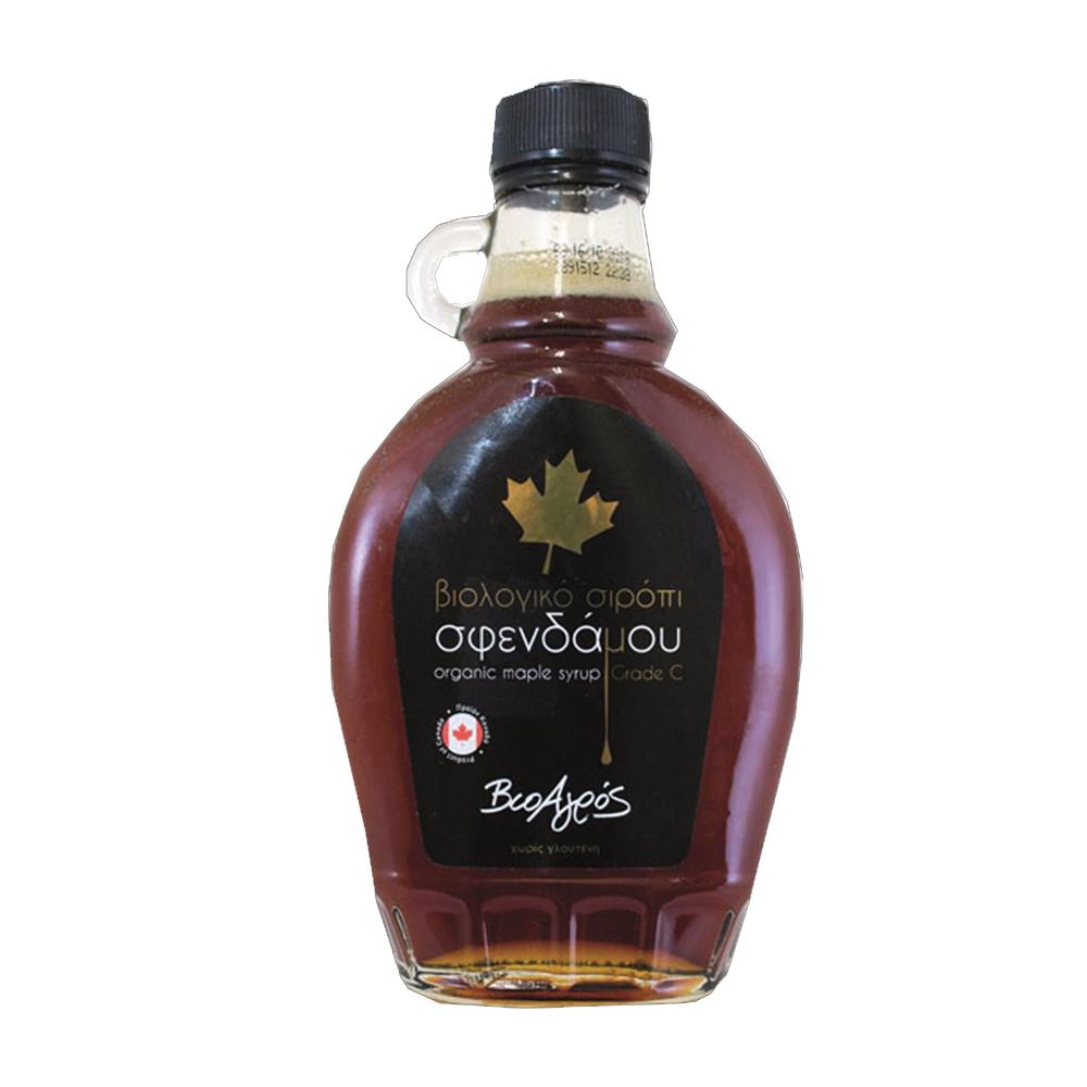 Βιολογικό σιρόπι που φτιάγνεται από χυμούς δέντρων σφενδάμνου στη. Μετά τη συγκομιδή ο χυμός συμπυκνώνεται για να μετατραπεί σε σιρόπι, διατηρώντας το φυσικό θρεπτικό περιεχόμενο και μοναδικά γλυκιά του γεύση.Το σιρόπι σφενδάμου χρησιμοποιείται σαν γλυκαντικό σε βάφλες, φρυγανισμένο ψωμί, δημητριακά, γιαούρτι, παγωτό, στη ζαχαροπλαστική αλλά και στο τσάι.