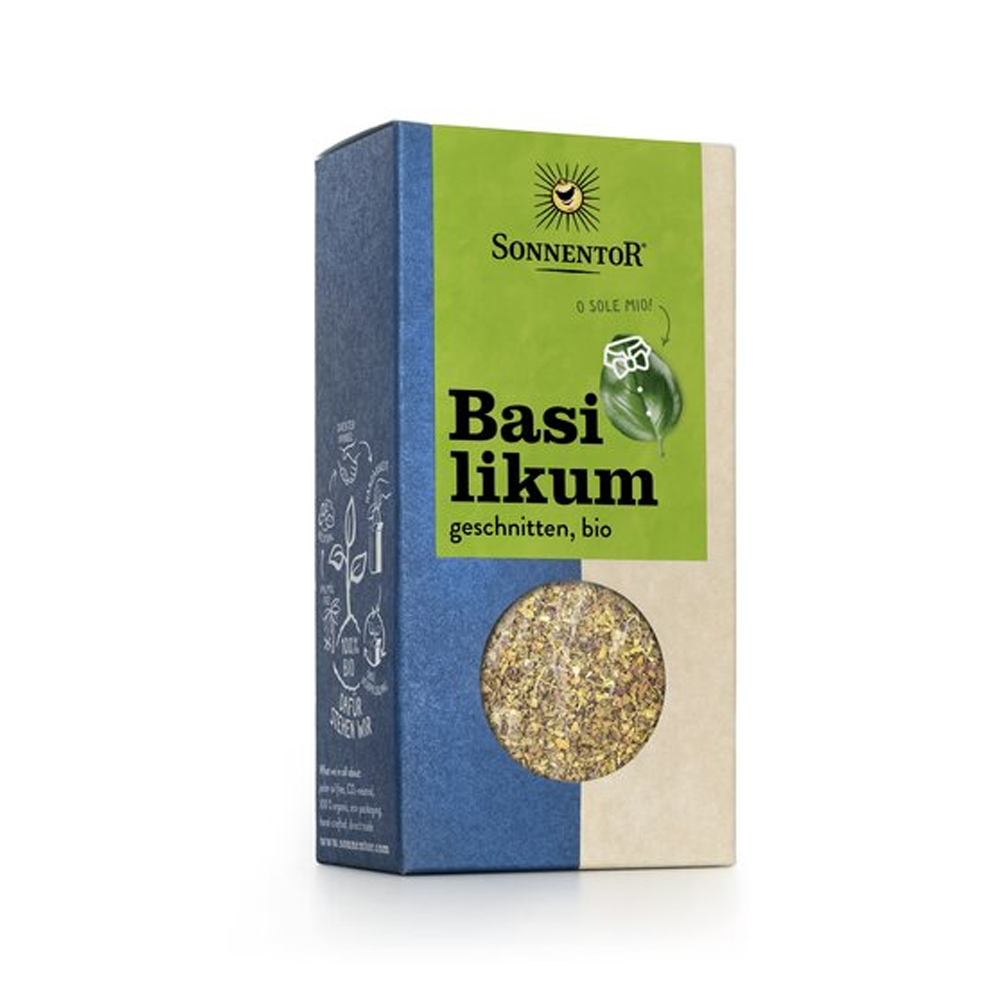 Βιολογικός βασιλικός.O βιολογικός βασιλικός της Sonnentor είναι το ιδανικό βότανο για τα ζυμαρικά , τις σάλτσες ντομάτας και το κοτόπουλο . Το άρωμα του βασιλικού είναι σχεδόν εθιστικό ! Γνωστός ως ο καλύτερος φίλος της ντομάτας και βασιλιάς της μεσογειακής κουζίνας . Προσθέστε βιολογικό βασιλικό σε σαλάτες,σούπες , ψάρι ,και λαχανικά .Είναι επίσης υπέροχος στο κρέας και τα πουλερικά.